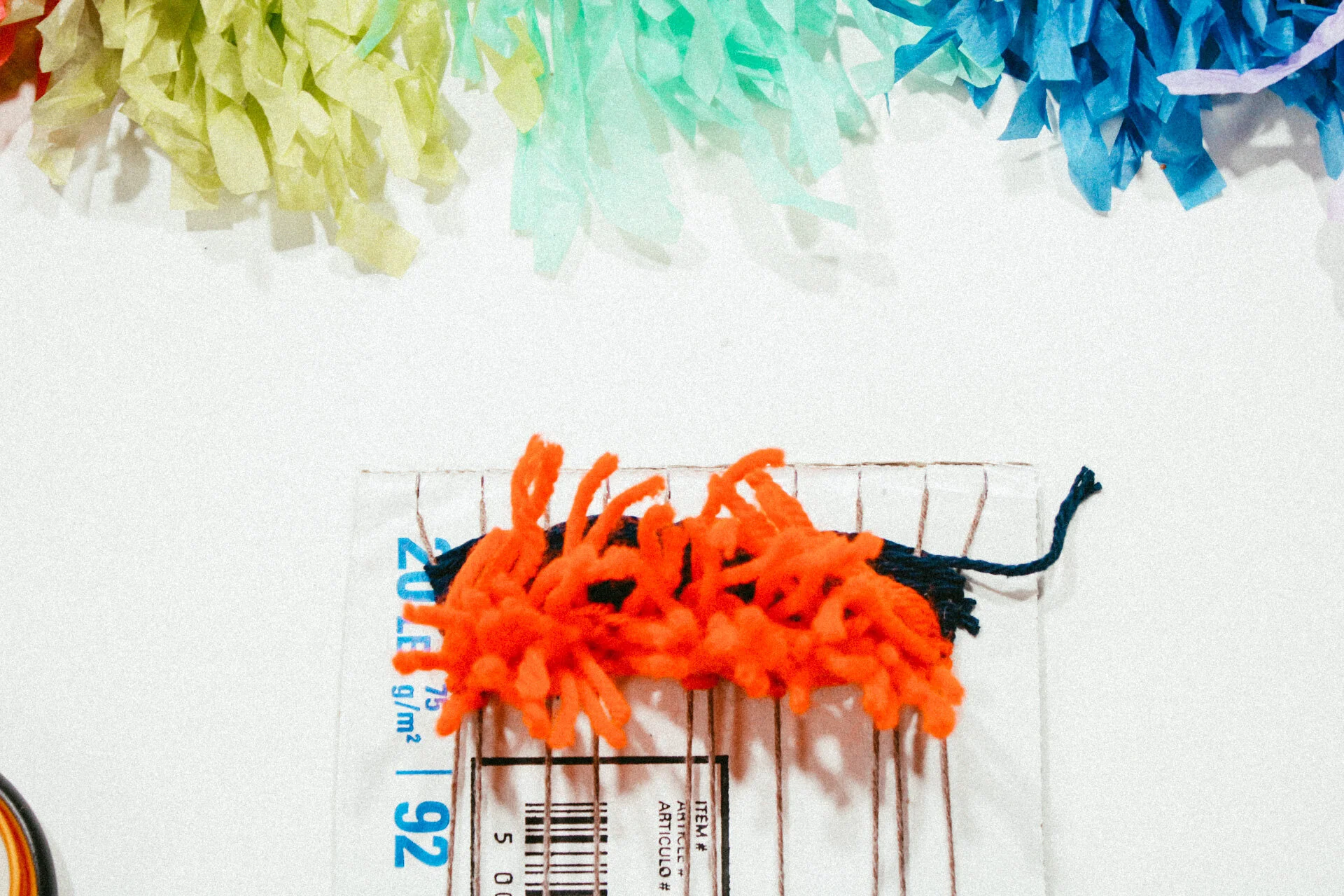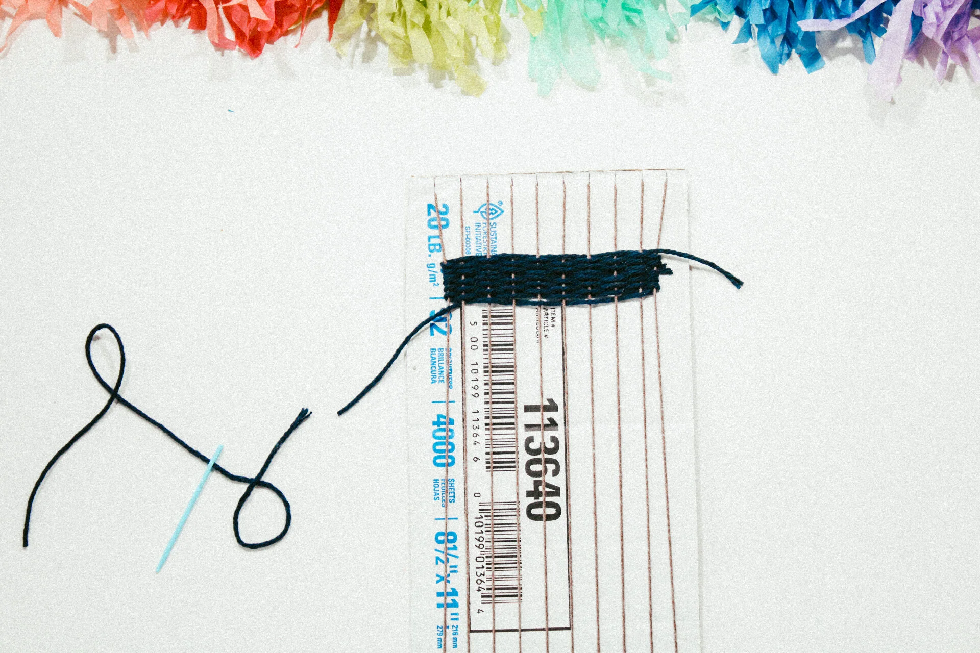 To create the Rya or a fluffy section in the weaving, cut several pieces of yarn. To cut many at once, wrap the yarn around a book and then cut the yarn in half.