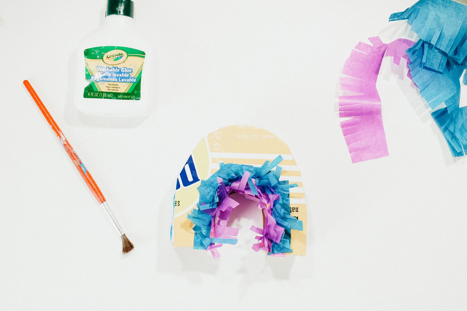 Step Four: Cover the rainbow with colors Start by lining the bottom with the purple tissue paper. Using a paint brush, paint a thin layer of white glue onto the cardboard and stick the tissue paper to to. Fluff up the frings to see where the next color goes. Work your way up to the top of the rainbow and each fringe should cover a bit of the fringe above.