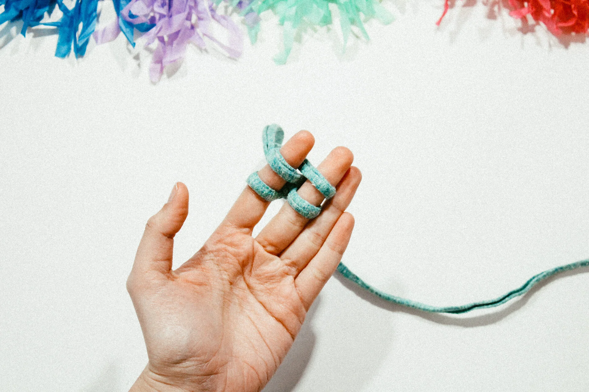 If you are using tee shirt yarn, you will need to double up that way it will be harder and more sturdy. You will also only be using two finger finger knitting. Leaving 8” of tail wrap the yarn over your forefinger and back and around your middle finger. Continue to wrap the yarn around your forefinger and back and around the middle, leaving two loops on each finger (including the tail)