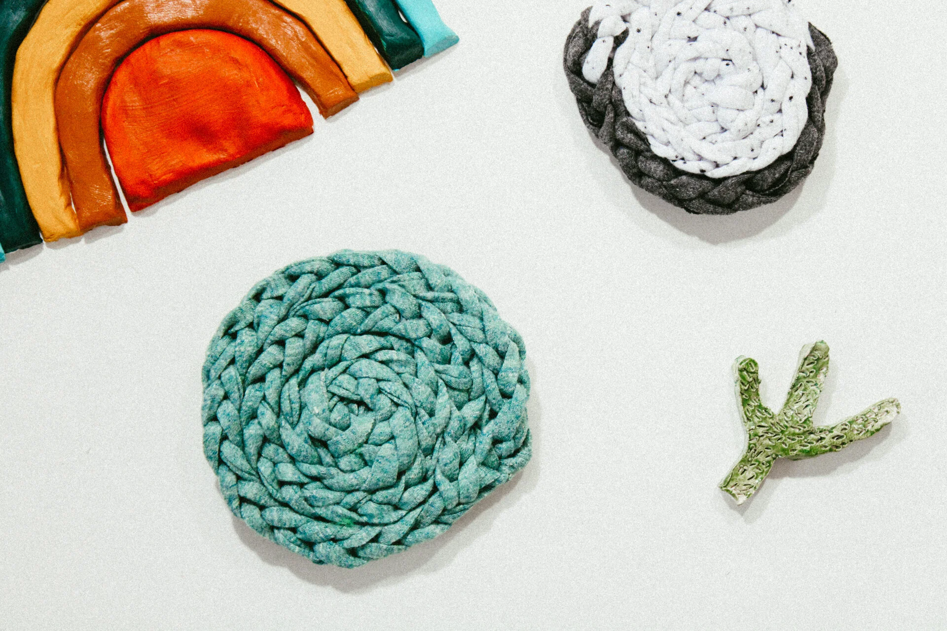 Keeping the finger knitting strand wrapped snugly to itself all the way around the coil, thread the tail through one loop of finger knitting again directly across from where the strand is. Continue in this pattern until you reach the end and you meet the end strand. Pull through the last coil of your finger knitting. By now you should have a full circle! You can easily tie a knot here at the top and then weave the ends through the back of the coaster/ trivet.