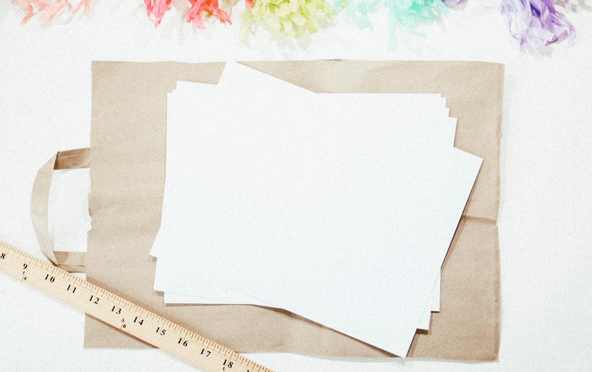 Unfold the white paper and line it up on the paper bag. Rip the bag into the same size of the paper and fold it in half. The white paper should be able to fit inside the paper bag.