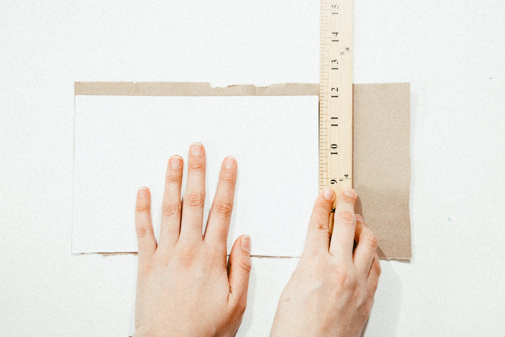 First start by taking 5 pieces of paper and folding them in half. Line up the ruler with the middle of the paper (where the crease is) and rip the paper in half. Now you will have 5 half pieces of paper. Fold those in half and that will be the size of your notebook.