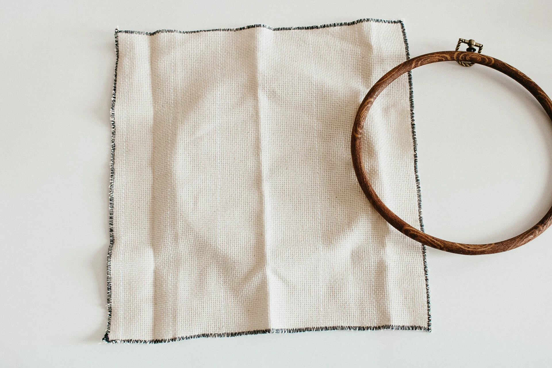 02. center your design drawn on monks cloth fabric and lay it over the white plastic hoop.