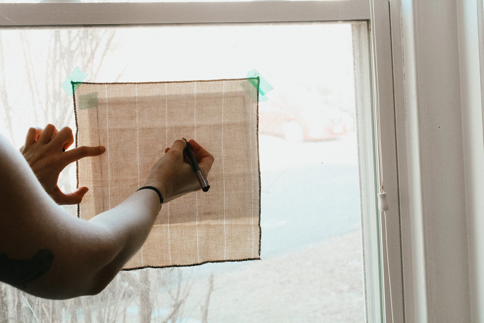 02. place the monks cloth up to the window and trace your design with a sharpie. make sure you are tracing in the middle of the fabric.