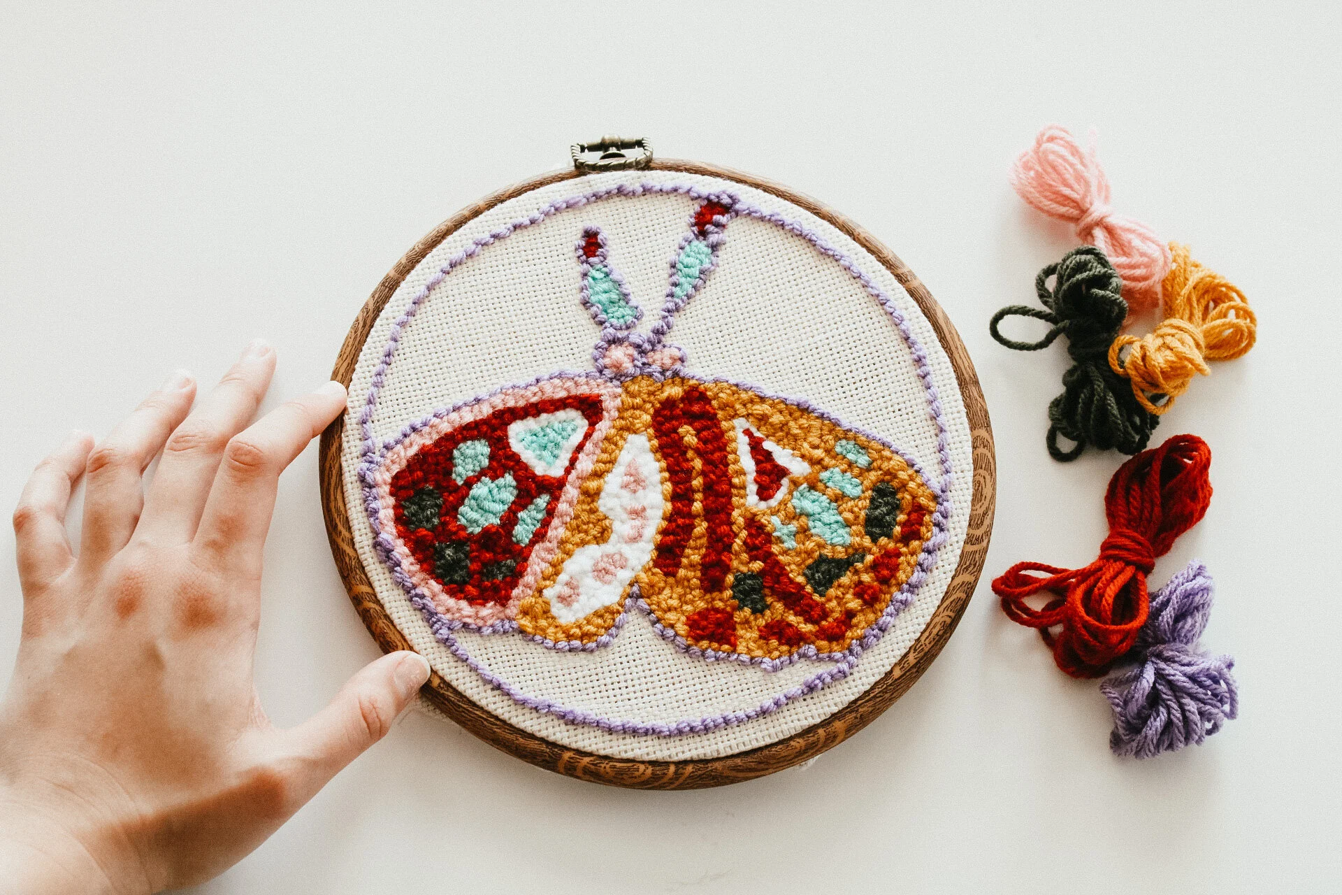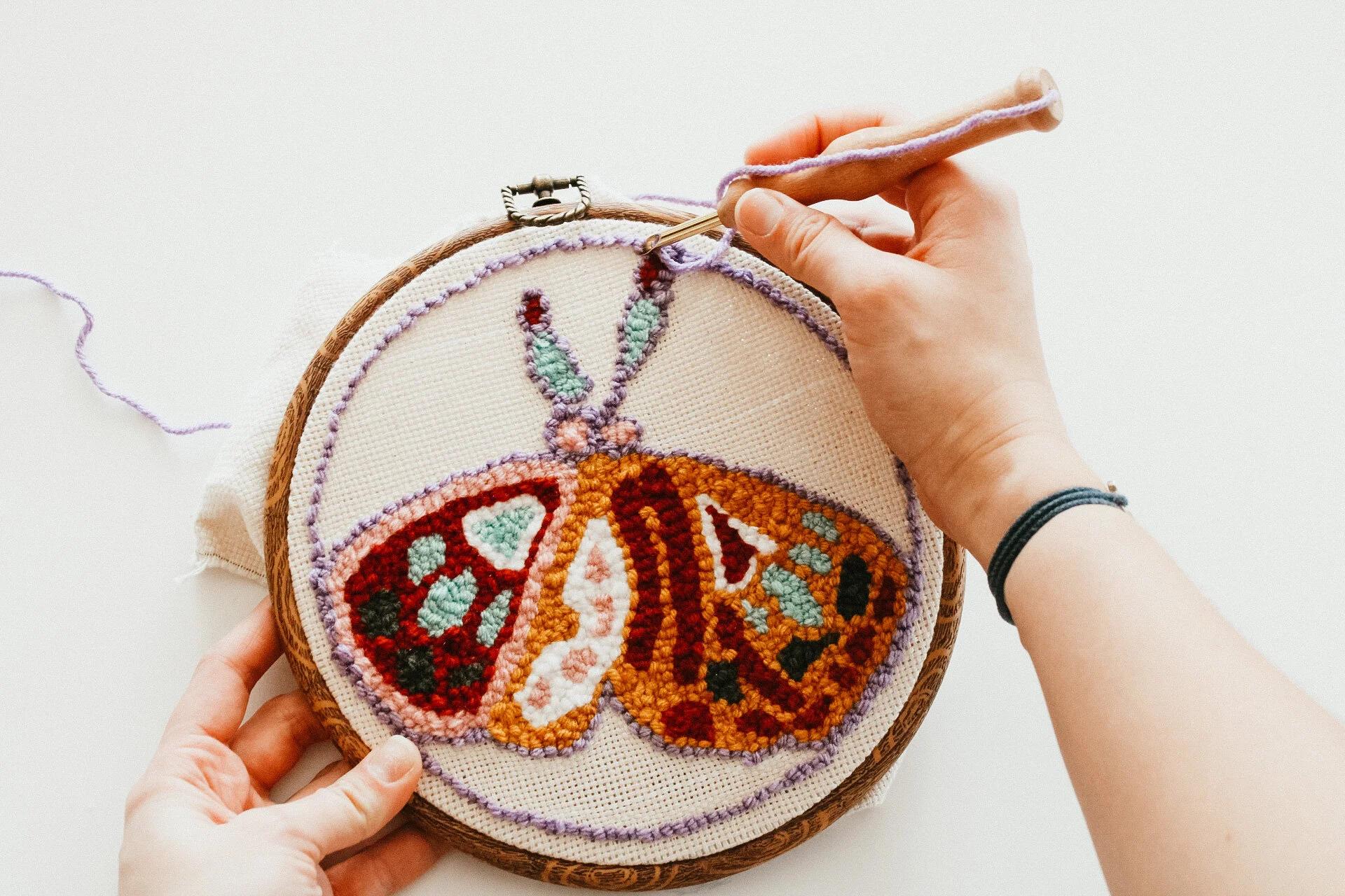 hello and welcome to your punch needle moth kit! i am so happy you are here! get excited to learn how to use all the materials in the box and make your one rainbow creation. you will learn how to thread your needle, how to stretch the fabric into your hoop and how to start punching.